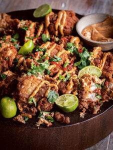 To serve, pile the chicken onto a platter, drizzle over the chipotle dressing and sprinkle the herbs and chillies over the top. Dot with lime wedges for squeezing.