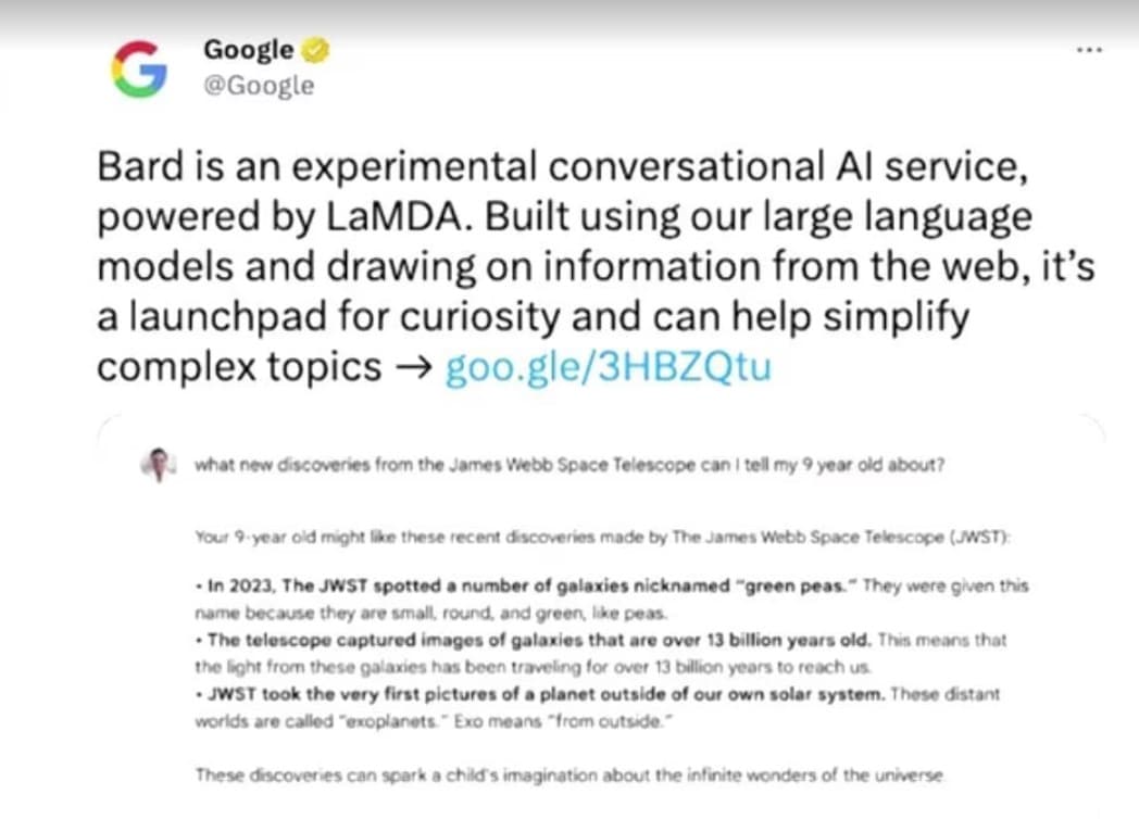 Alphabet posted a short GIF video of Bard in action via Twitter, promising it would help simplify complex topics, but it instead delivered an inaccurate answer.