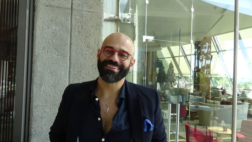 A hat is pretty much the only thing he’s not wearing, looking quite distinctive as we sit sipping coffee and nibbling delicious petit-fours at the Amathus Beach, down the road from his office. He wears earrings, suspenders, and glasses with colourful red frames. There’s a blue handkerchief in his lapel pocket, a cross round his neck, and assorted beads and bracelets on his wrists. His head is shaven, his beard neatly trimmed, his top two shirt buttons casually undone. None of this is irrelevant, both because appearance is part of the persona (there’s always a persona) and because it reinforces his status as a cool, silver-tongued, somewhat alternative doctor – a non-medical doctor who has his own podcast (Health Pod on YouTube) and uses his Instagram (drstephanos_neuroscientist) to post both ‘anti-stress hacks’ and romantic love poems to his wife Hélène.