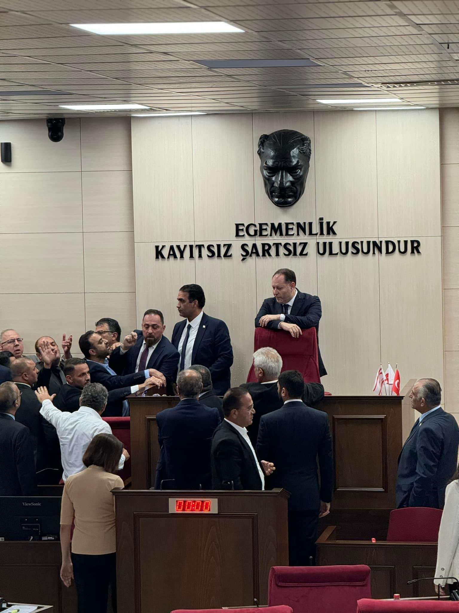 The ongoing argument over whether ruling coalition party UBP ‘MP’ Ziya Ozturkler is or is not the north’s ‘parliament speaker’ became physical in ‘parliament’ on Monday, as he once again attempted to insist on presiding over proceedings.