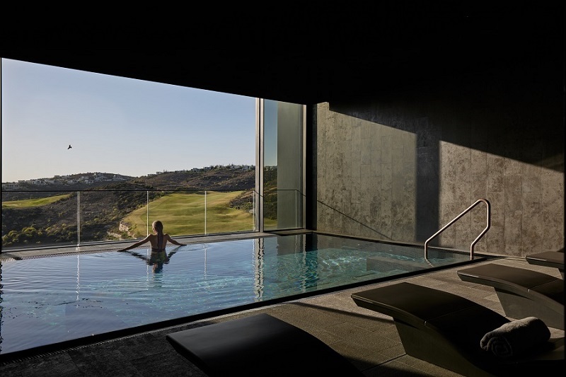 Inside, floor-to-ceiling windows frame sweeping views of the Troodos mountains. The facilities — a 25-metre indoor pool, hydrotherapy pool, aroma and Finnish saunas, ice fountains, experience showers and eight thermal suites – are designed to create a restorative, immersive environment.