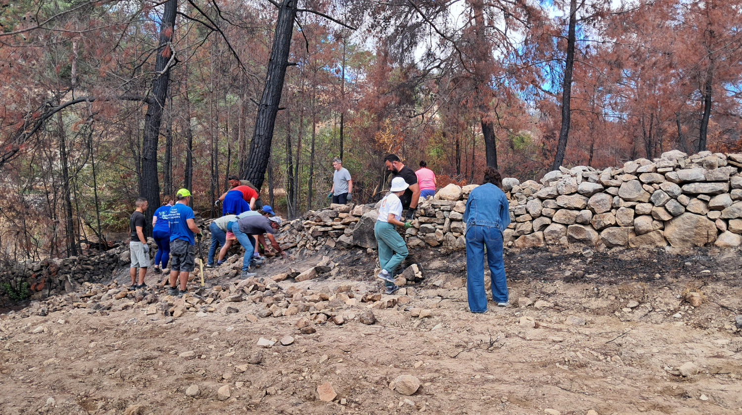 On Saturday, with support from the Souni-Zanatzia community and 20 volunteers, 36 metres of stone walls were repaired across two burnt sites.