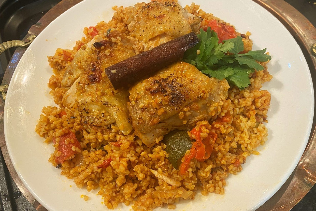 Remove from the oven, taste the sauce and adjust seasoning if needed. Stir in an additional 200ml hot water and mix in the cracked wheat (pourgouri), ensuring it’s well combined with the sauce. Return to the oven for 25-30 minutes, or until the pourgouri is tender and has absorbed the liquid.