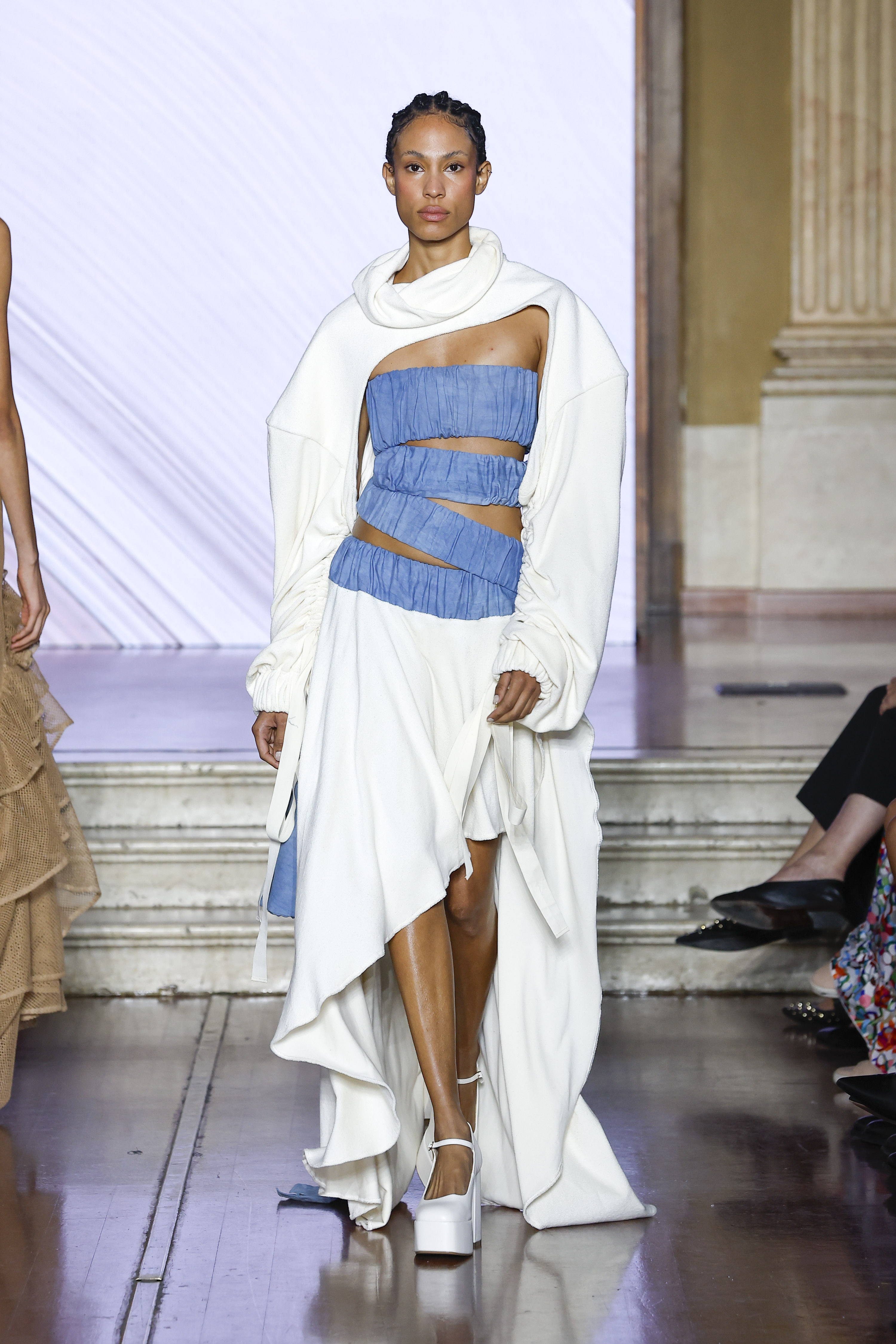 From the sun-washed tones to the textured walls and the sand, natural tones are central to the collection. The Mediterranean is overwhelmed by the colour blue, from the ceramics, the doors and windows to the sea and the sky and all those warm summer moments which define it. “Most of the collection is a direct reference to the Mediterranean table,” said Koral. He wanted to evoke the casual, spontaneous image of napkins thrown on the table, which is why the garments make use of distressed materials, conveying abundance and messiness. “I wanted the garments to feel grand, yet to have to have a sense of movement and spontaneity,” he said. The Spanish inspiration is evident in the handmade crochet, ruffles and flamenco-like silhouettes, while the blue tile and ceramic patterns are characteristic of Portugal and Italy.
