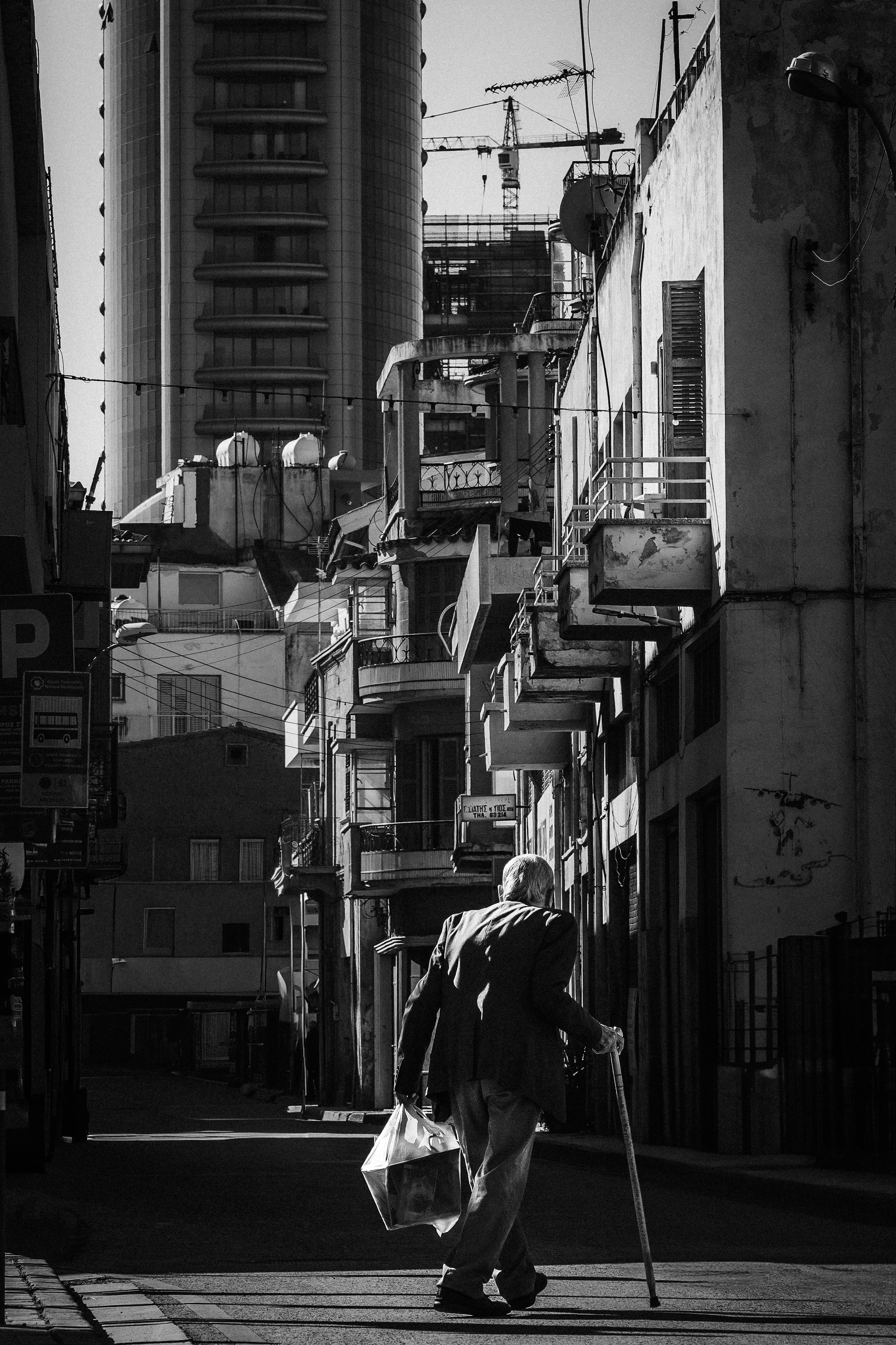 One photo in particular exemplifies both his style and the “layers of history” contained in the old town. Shot in black-and-white with a long lens (probably the 100mm, his favourite), it shows a compressed conglomeration of elements: old houses in the foreground, a skyscraper – seemingly just behind, though that’s a trompe l’oeil effect – blocking out the sky in the background, then an old man walking with a cane in the extreme foreground.