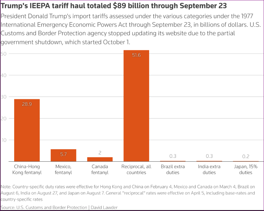 The IEEPA tariffs collected so far this year make up the biggest portion of a $118 billion increase in net customs receipts in the 2025 fiscal year that ended on September 30. That helped offset rising healthcare, Social Security, interest and military outlays, helping shrink the U.S. deficit slightly to $1.715 trillion.