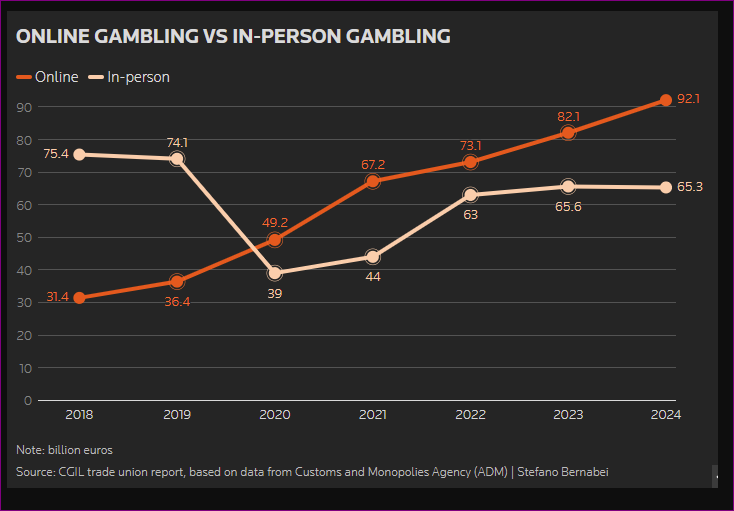 The growth of Italy’s gambling industry has outpaced Britain, Germany, and France, with gross gaming revenues – the difference between the amount wagered and the amount won – hitting 21.5 billion euros ($25 billion) in 2024.