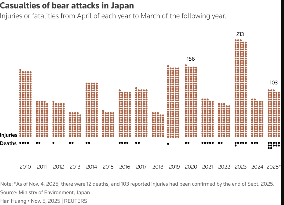 There have been more than 100 bear attacks with a record 12 people killed across Japan since April, according to the Ministry of the Environment. Two-thirds of those deaths were in Akita prefecture, where Kazuno is located, and nearby Iwate.