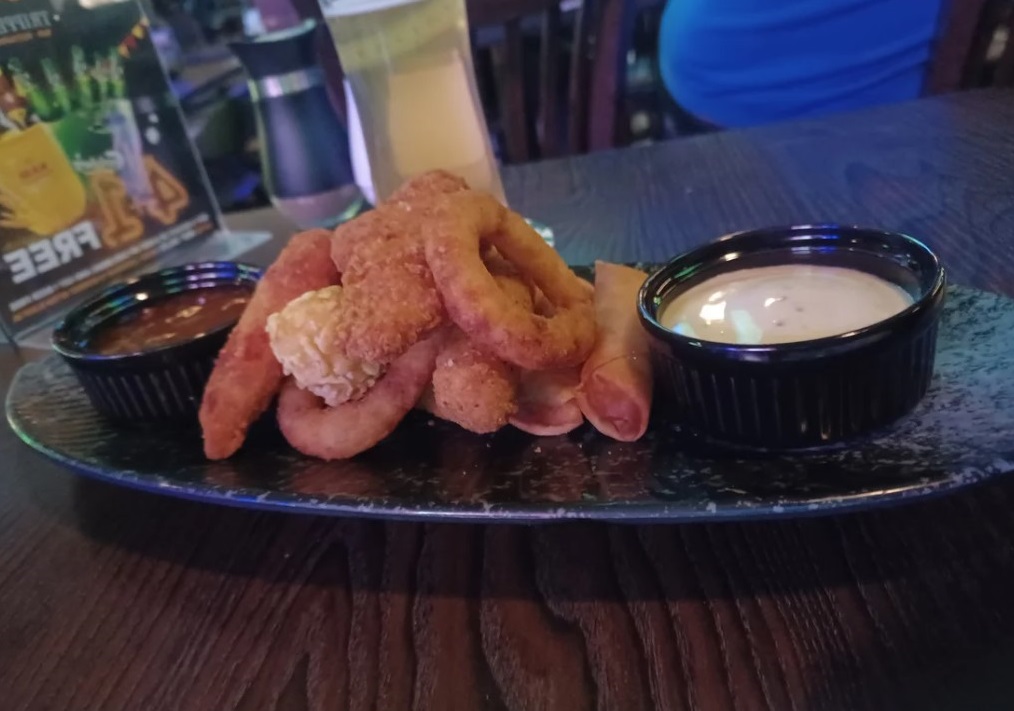 We started with a pint of beer (reasonably priced, although Limassol’s average market rate may sting visitors from other cities in Cyprus) and a platter of appetizers (€9). They include spring rolls, chicken nuggets, chicken strips and onion rings. This is meant for two people (you get two of each item) so be aware that it is not as comprehensive as the larger platters mentioned on the menu, which can be shared among more. All of the items were perfectly fine and it works well as a side for a beer or two.