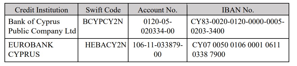 The prescribed fee for both the written and oral examinations can be deposited into the following accounts of the Cyprus Stock Exchange: