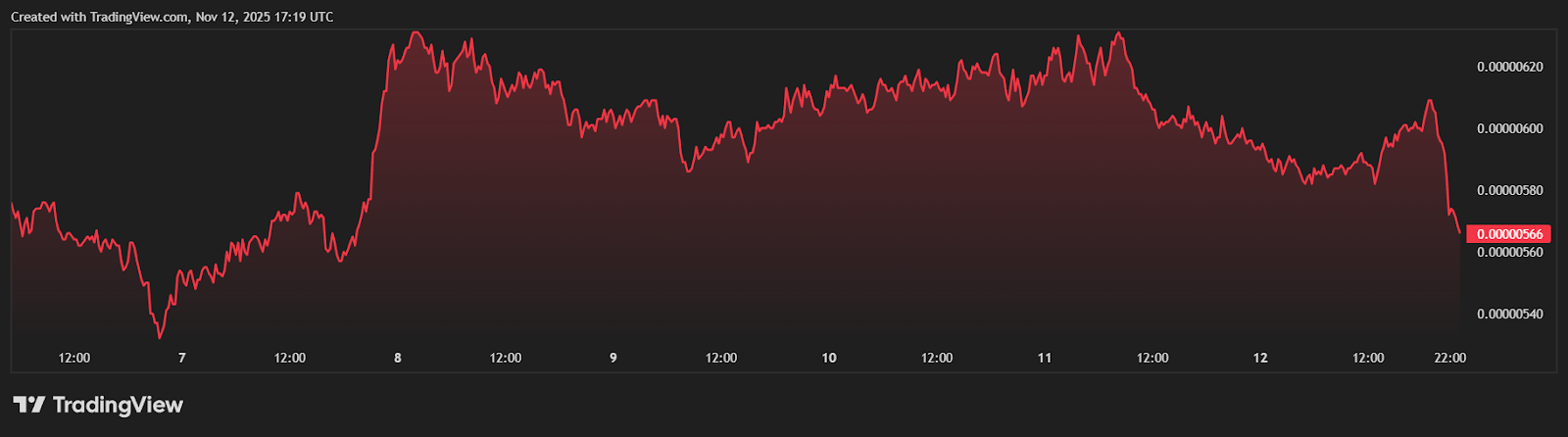 Pepecoin (PEPE) has also lost steam following its sharp rise earlier in 2025. It’s currently priced at around $0.0000056, with a market cap close to $2 billion. Despite being one of the more recognizable meme tokens, PEPE is encountering persistent selling pressure and investor fatigue as new meme projects dilute overall attention.