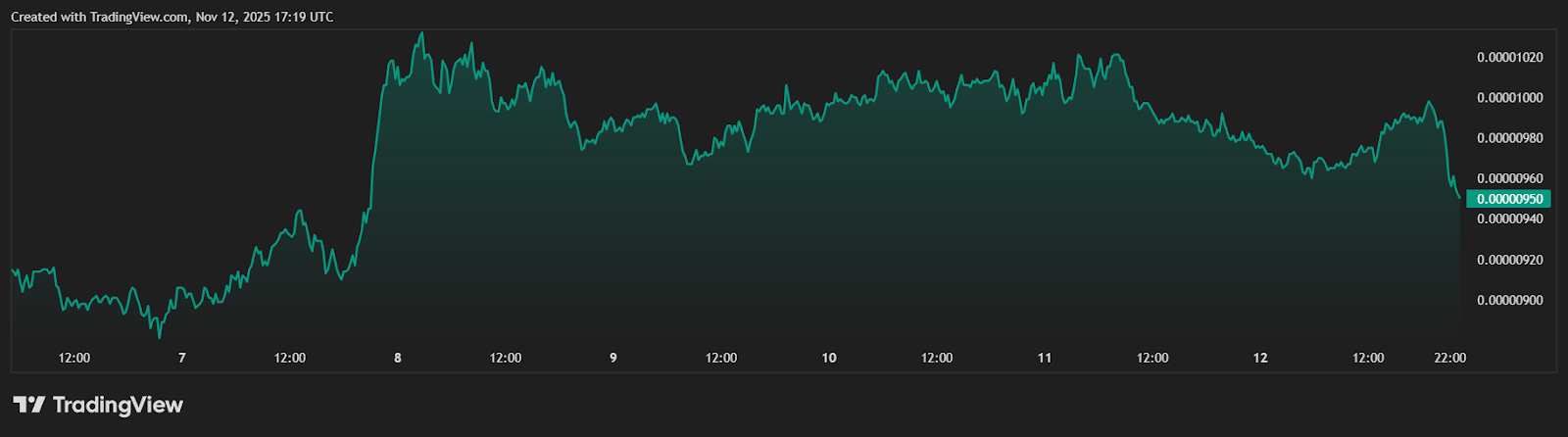 Shiba Inu (SHIB) currently trades around $0.000009, giving it a market cap of roughly $13.6 billion. The token remains one of the most recognized meme coins in the crypto industry, often referred to as the Dogecoin killer. Its community remains large and active, but the market is showing clear signs of fatigue after SHIB’s impressive multi-year run.
