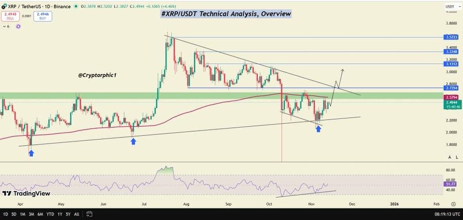XRP has been consolidating near its $2.35 support after a brief correction, signaling a steady build-up of buying interest. Despite pressure across the broader market, bulls have defended this level consistently, positioning the asset for another push toward the $2.60 resistance.