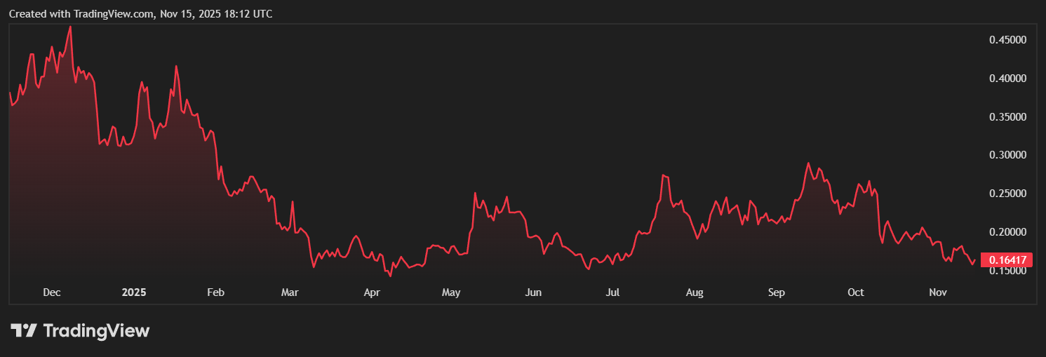 Dogecoin is currently trading near $0.16, and its market cap sits at around $24 billion. Despite this large valuation, the price has struggled to find strength. DOGE faces major resistance levels at $0.18, a zone where it repeatedly fails to break through, and another larger resistance band between $0.24 and $0.29.