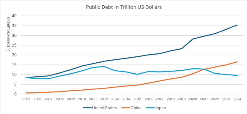 Furthermore, among the major European economies, only Germany has managed to keep its debt relatively stable over the past 20 years. Even in this case, the country’s debt has increased from $1.9 trillion to $3 trillion. In contrast, France’s debt more than doubled, while the UK’s more than tripled. In Italy, as debt was already high, the increase was smaller. With the exception of Germany, the debt of the other three countries (the United Kingdom, France, and Italy) far exceeds 100 per cent of GDP. Although Italy’s debt-to-GDP ratio is the highest, France is in the worst position with huge budget deficits and great difficulties in reducing them.