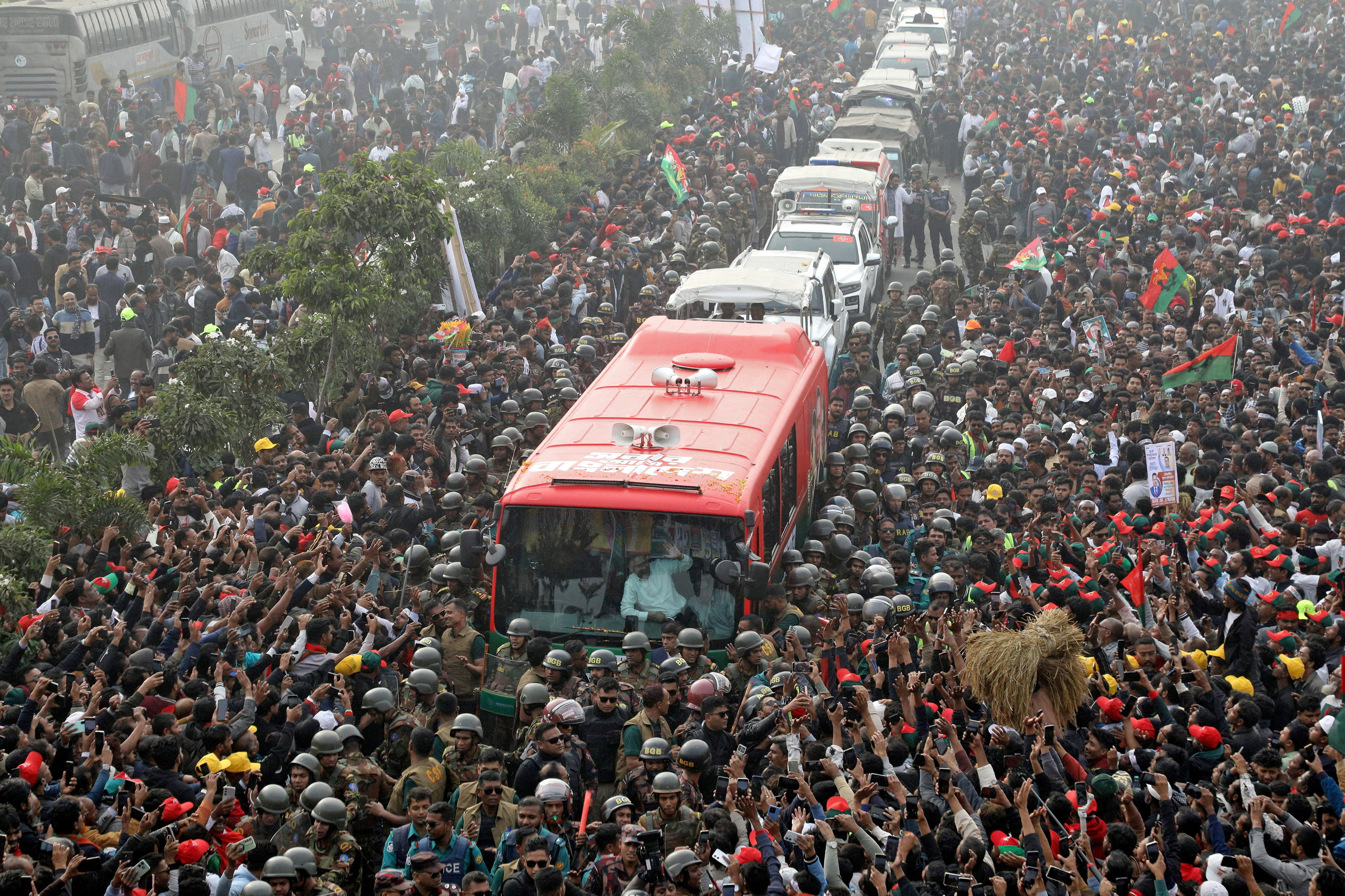 Hundreds of thousands of supporters lined the route from Dhaka’s airport to the reception venue, waving party flags and carrying placards, banners and flowers, while chanting slogans welcoming Rahman, as senior BNP leaders received him at the airport under tight security.