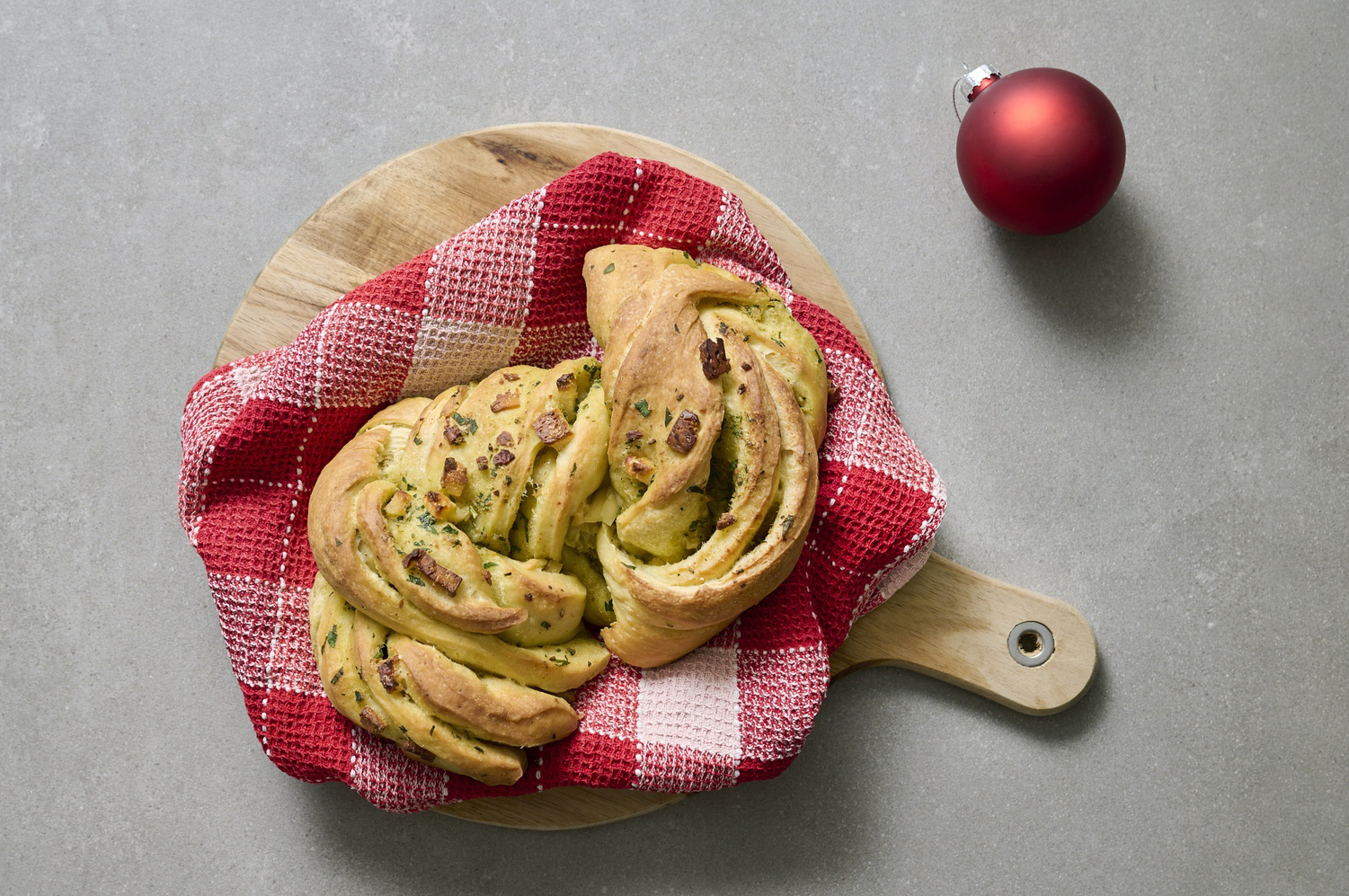 Wrap half of the braid on the left, stopping when you reach the middle. Then, wrap the second half in the opposite direction, thus forming a figure eight. Carefully move the bread onto a baking sheet lined with parchment paper.