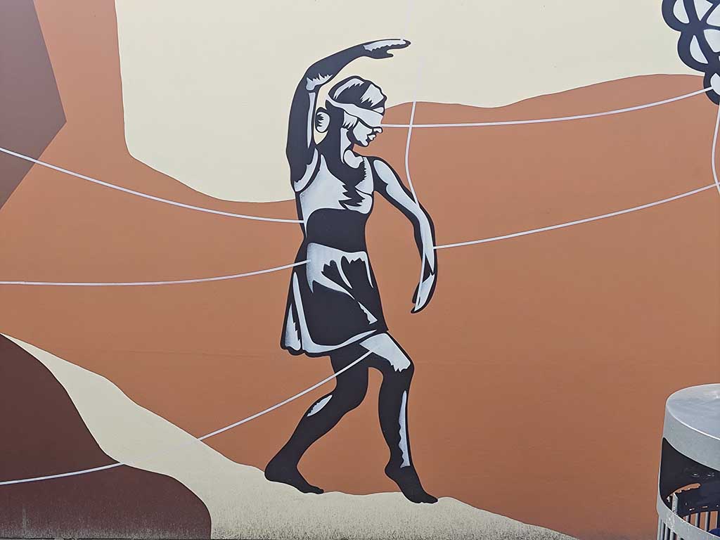One panel shows a man walking a tightrope, standing for the disadvantaged locals who are just “trying to balance”, as he puts it. “It could be financial struggle, mental struggle. It’s about balancing.”