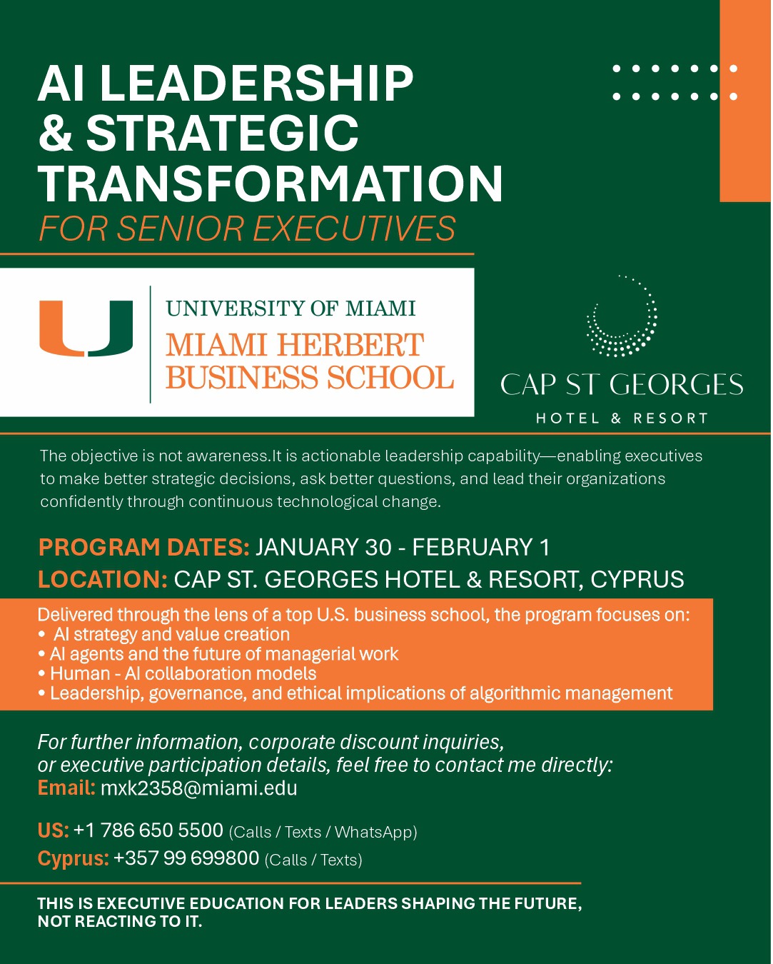 Cyprus and Paphos will host a high-level international executive education program titled AI Leadership & Strategic Transformation for Senior Executives, taking place at Cap St Georges Hotel & Resort from January 30 to February 1, 2026.