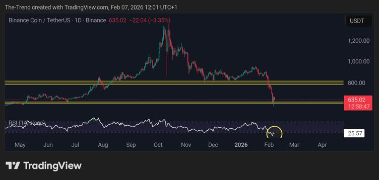 Binance Coin (BNB) has recently pulled back from its previous range and is now resting on a key higher-timeframe support zone around $620–650, an area that has historically attracted buyers. While the RSI indicates that the token is deeply oversold, hinting at potential seller exhaustion, price action confirmation is still needed before any decisive move can be expected. This indecisiveness has seen investors looking for quicker upside prefer MUTM during its presale.