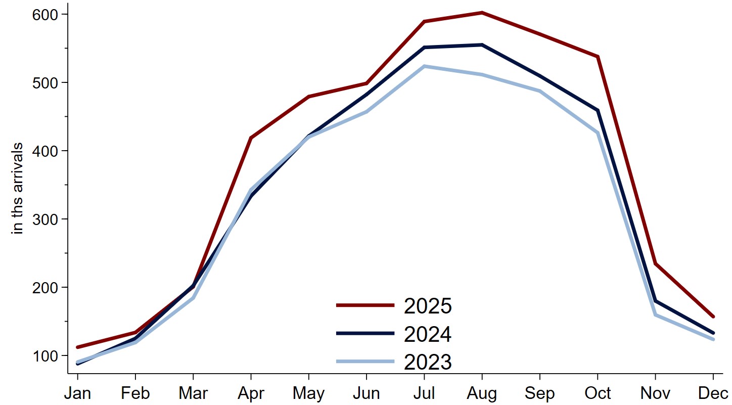 Monthly arrivals followed the familiar seasonal pattern, building from spring and peaking in summer, but remained above recent years throughout much of the high season, supporting employment, fiscal receipts and corporate earnings across hospitality, transport and retail.