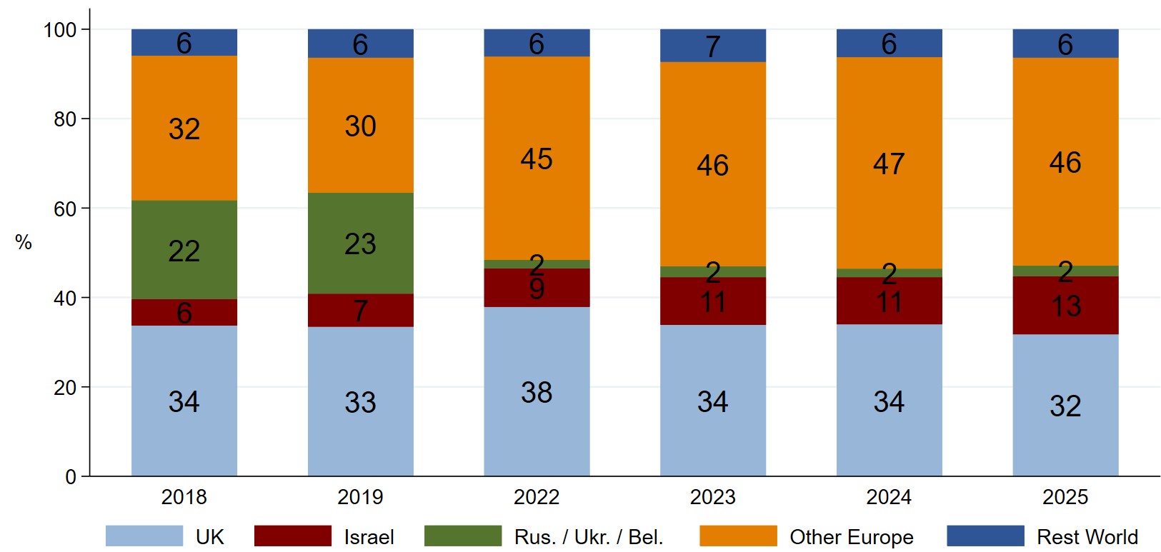The United Kingdom remains the largest source market for Cyprus, although its share eased, while Israel’s contribution increased materially and Germany recorded a marginal rise.