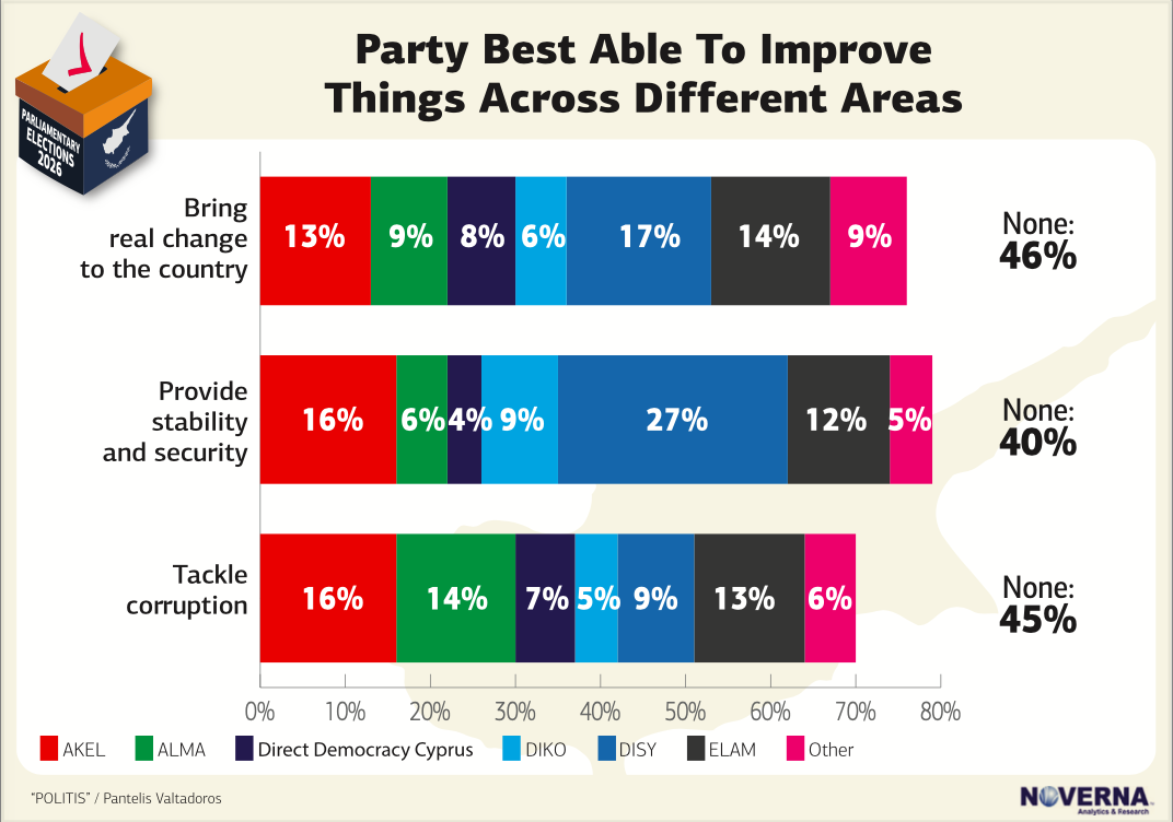 Forty-six per cent of respondents believe no party can achieve reform, while among those expressing confidence, Disy leads at 17 per cent, followed by Elam at 14 per cent and Akel at 13 per cent.