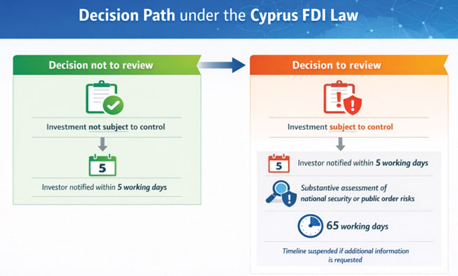 The Cyprus FDI regime must also be considered alongside other domestic regulatory frameworks. Depending on the sector and transaction profile, clearance or engagement with the Cyprus Competition Commission (CCC) and sectoral regulators such as the Cyprus Securities and Exchange Commission (CySEC), the Central Bank of Cyprus (CBC), or the Cyprus Broadcasting Authority (CBA) may be required. As a result, transactions may be subject to multiple, overlapping regulatory processes that must be coordinated to avoid execution risk.
