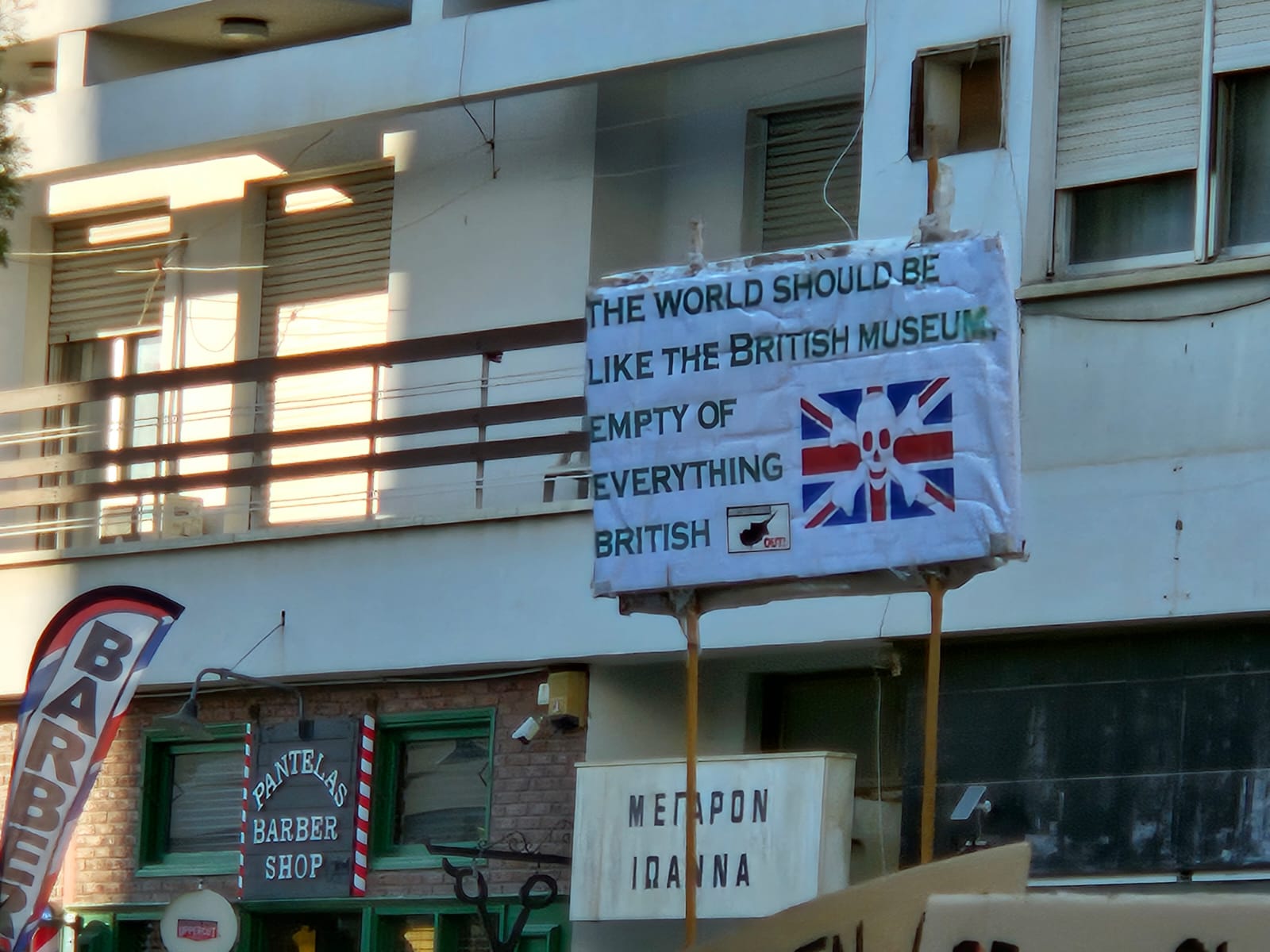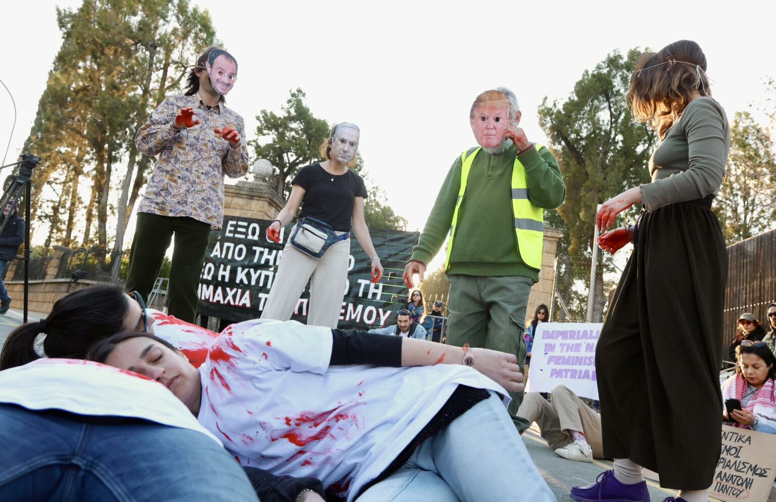 Those taking part carried banners reading ‘Cyprus is not your launchpad’ and ‘British Bases out’. A die in performance was also staged as part of the event, outside the presidential palace.
