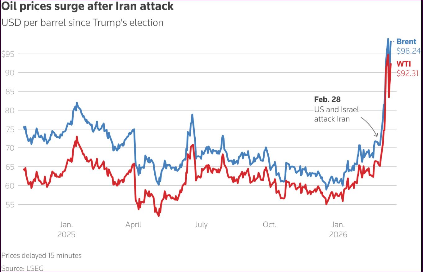 Brent crude LCOc1, which hit $119.50 a barrel on Monday, its highest since mid-2022, was up more than 6% on Thursday at just below $98 a barrel.