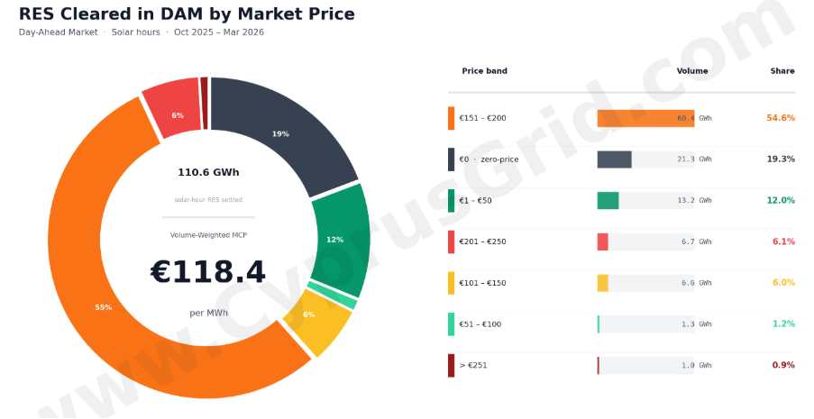 Market data shows that during solar generation hours, the weighted average price is approximately €118/MWh for the period October 2025 to March 2026. At the same time, nearly 20 per cent of these hours clear at zero price, meaning a significant portion of energy entering the market receives no remuneration at all.