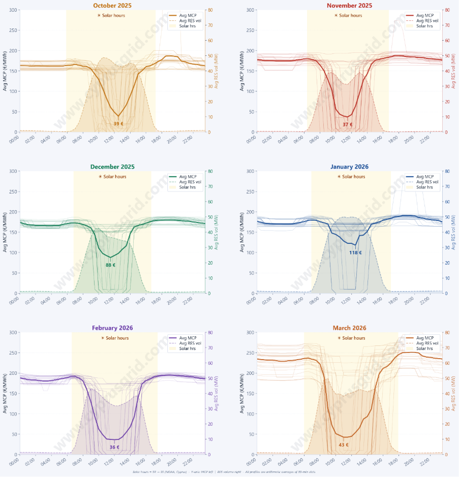 To better understand market behaviour, the following analysis of intraday price evolution shows a consistent pattern: during periods of high renewable generation, prices are significantly suppressed. Indicatively, prices drop to approximately €39 in October, €37 in November, €36 in February, and around €43 in March.