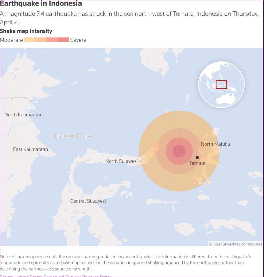 Though the epicentre is within 150 km (93 miles) of densely-populated islands like Ternate and Sulawesi, USGS said there was a “low likelihood” of further casualties, and economic damage was also expected to be limited.
